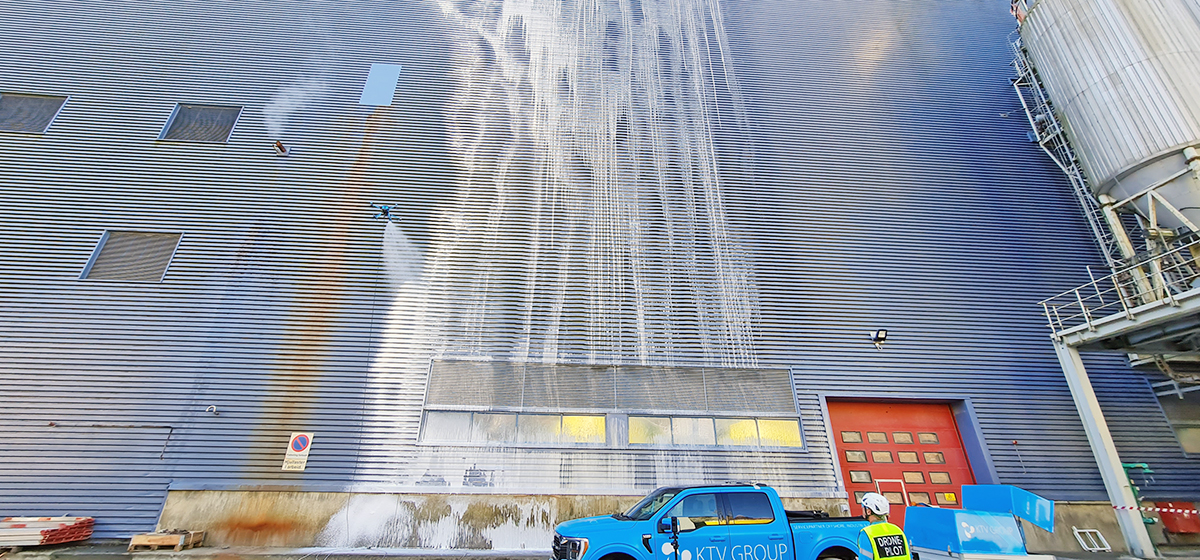 The facades are gently cleaned with the SelfCleaner method, foamed on by the KTV Working Drone to avoid damage from high pressure. Both the method and the drone are developed by KTV Group, and have been in use since 2020. Equipment and methods like this simplify the work considerably, and you avoid personnel in large lifts, work in heights or use of access technology.