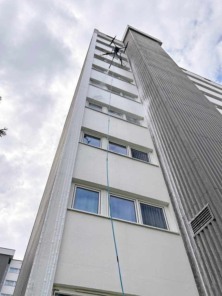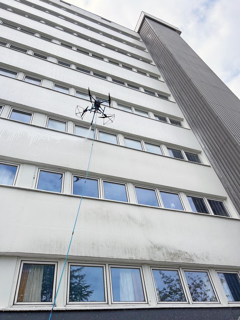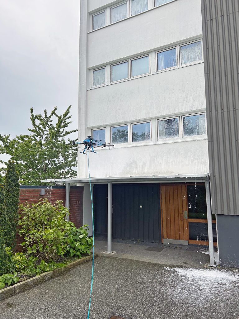 KTV Group Agder har nylig gjennomført fasadevask av Borettslaget Storhagen i Hillevåg i Stavanger. Arbeidet ble utført med KTV Working Drone, som påførte KTV SelfCleaner på boligblokkene.