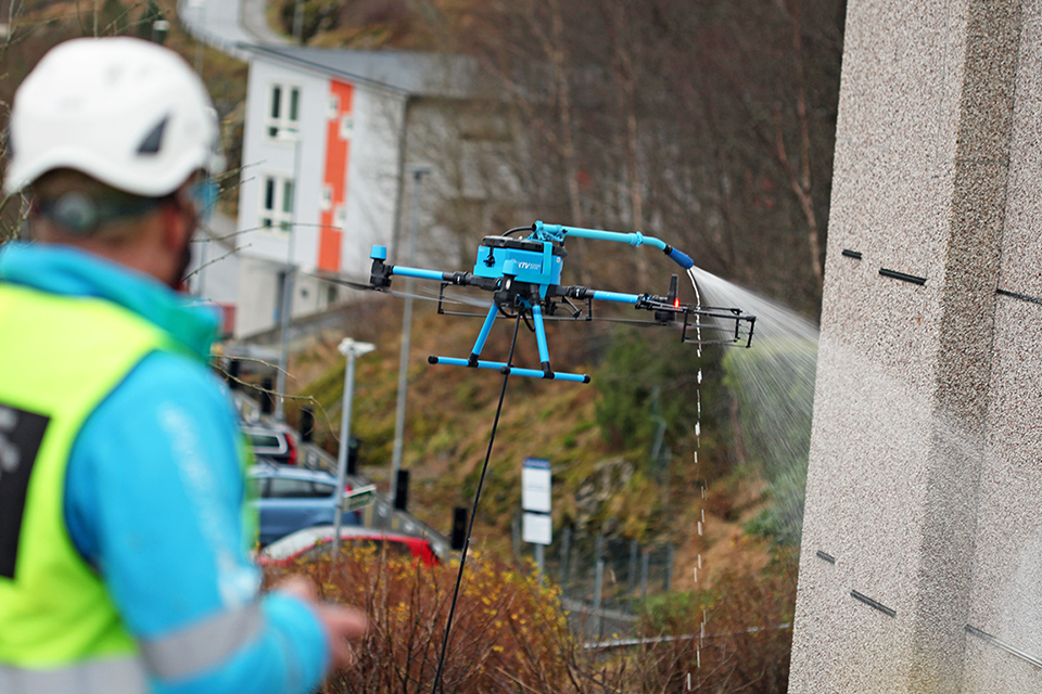 KTV Working Drone løser oppgavene med utfordrende plasser, spesielle fasader, mye trafikk og vanskelig tilkomst. Arbeidsdronene våre er i disse miljøene, også sikret fra tak slik at de aldri kan falle ned om noe skulle skje. Denne sikringsmetoden er en metode vi har utviklet selv, og den er under internasjonal patentbehandling.